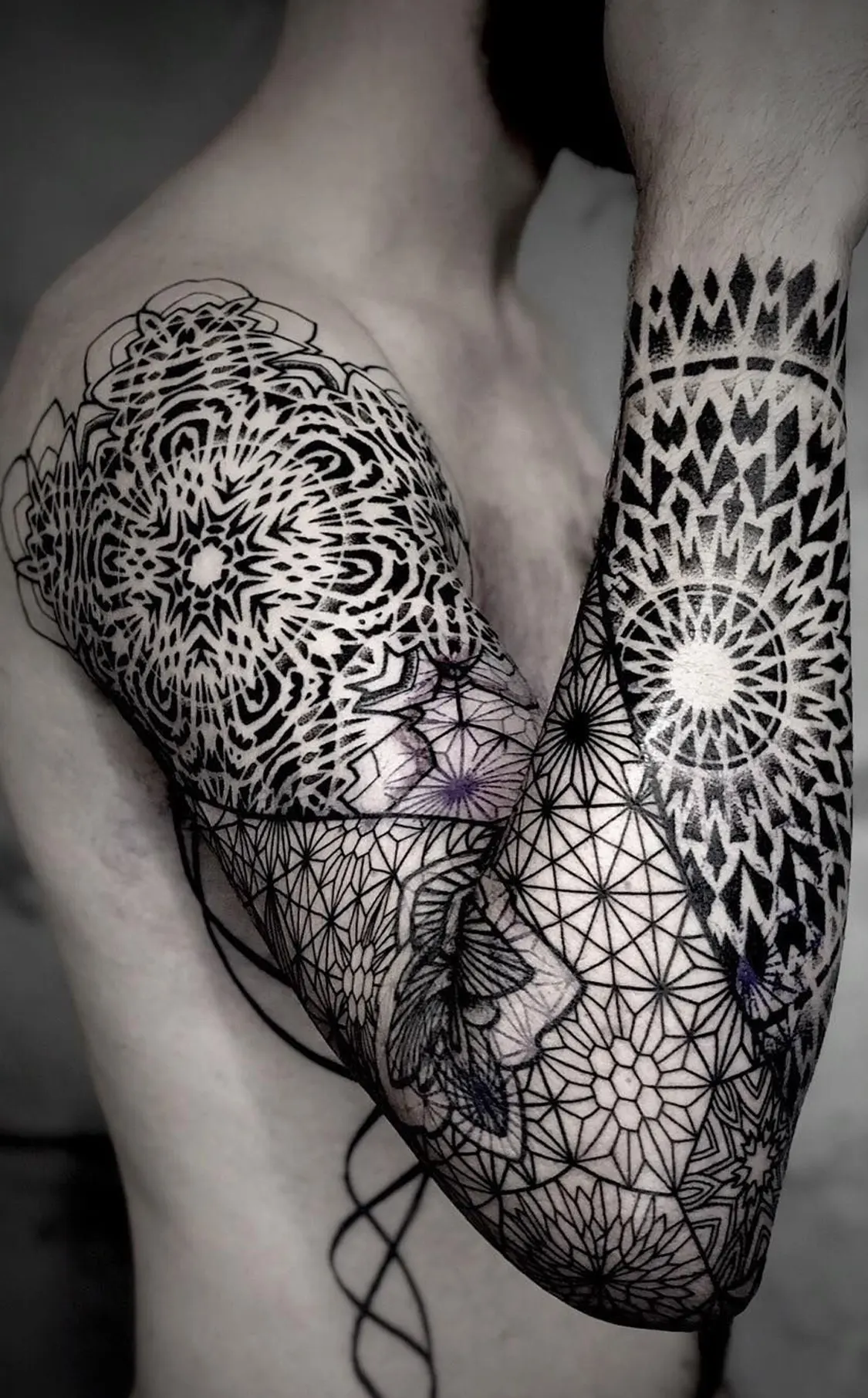 Особый стиль нательной живописи, при котором рисунок состоит из большого количества точек. Отличие стиля Dotwork от других заключается в том, что основная роль в нем отведена весьма строгим орнаментам и геометрическим формам.
